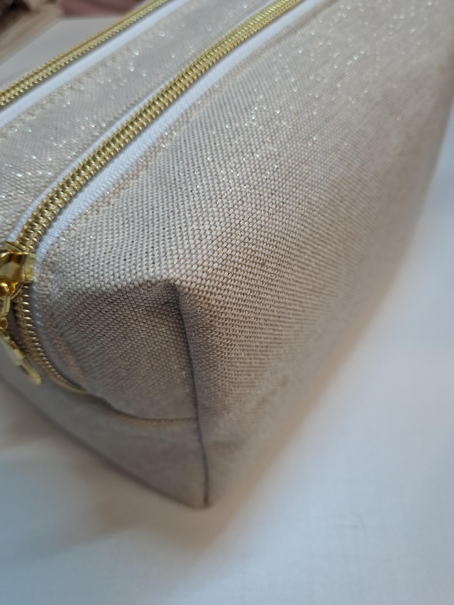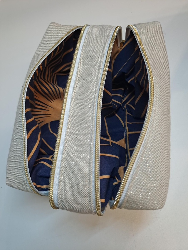 Tissu extérieur beige et doré, tissu intérieur coton bleu à motifs jaune/doré